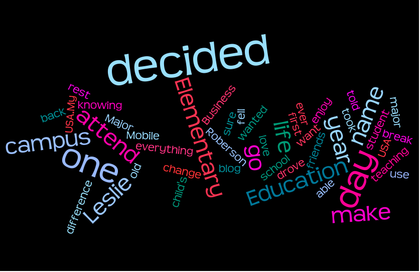 My name is Leslie and I am a 27 year old student. I use to be a Business Major and decided that is not what I wanted to do the rest of my life... So I decided to change it to Elementary Education, I enjoy knowing that one day I will be teaching and able to make a difference in a child's life. I decided to attend USA because I drove over to Mobile one day with friends and on to the campus and fell in love with the campus and told myself one day I want to go here. I took a 3 year break from school and when I decided to go back I did everything I could to make sure I would attend USA.